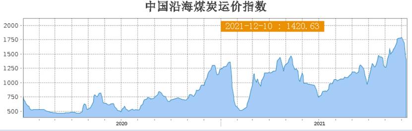 本周,沿海煤炭航運(yùn)價(jià)格大幅回落。截至12月9日沿海煤炭運(yùn)價(jià)指數(shù)為1437.3,較上周同期下跌344.85點(diǎn),跌幅19.35%;較上月同期下跌153.96點(diǎn),跌幅9.68%;較去年同期上漲274.9點(diǎn),漲幅23.65%。
